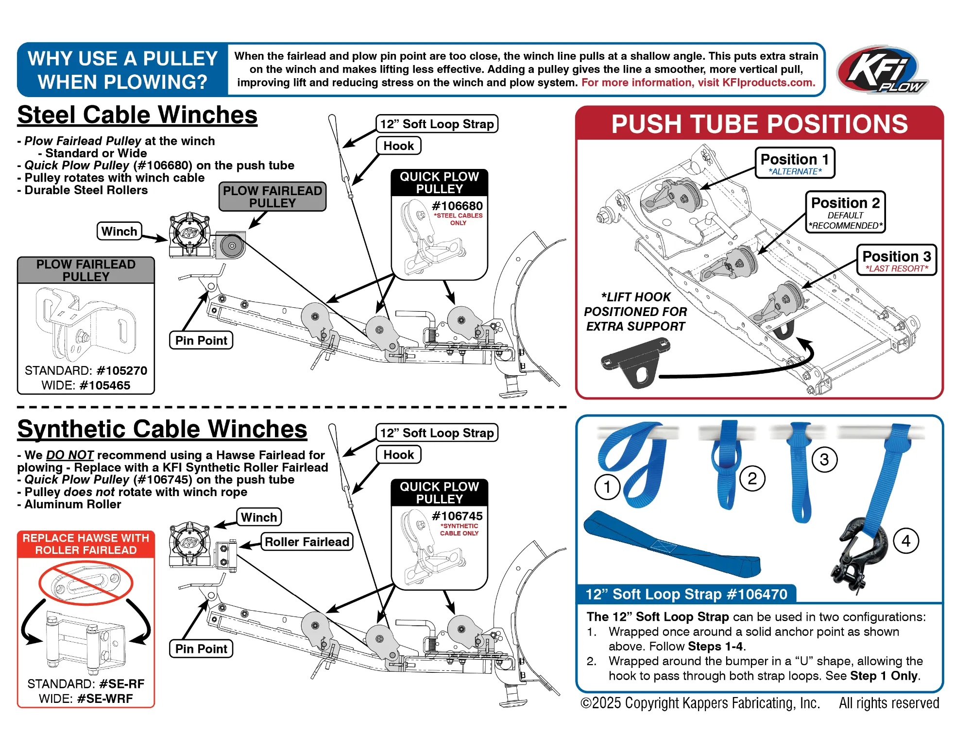 The KFI Winch Plow Roller is designed for use at the winch fairlead location when plowing with a steel cable winch. It replaces the standard winch fairlead during plow season to improve cable movement, reduce wear, and extend cable life.
